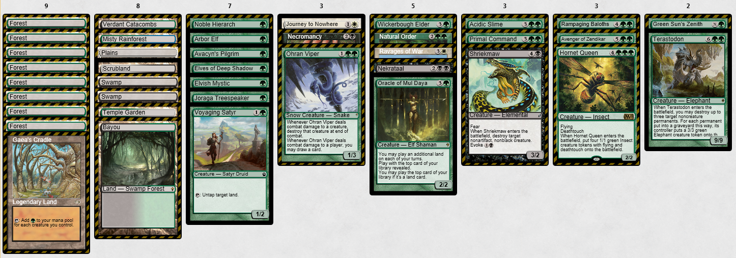 This third deck felt like my masterpiece, the culmination of all that I had learned about drafting green in the previous two drafts. It contained even more ramp than the first deck, and all of it stuck around, turn after turn. In this deck, more than the others, I was vulnerable to too many elves, not enough payoff syndrome, as natural order was the only way to make a useless elf into a relevant card. However this drawback was more than compensated by just how much more explosive this deck could be in comparison to the previous two, with the addition of gaea's cradle. Ordinarily, you have to rely on natural order or rofellos to stick a primus or terastodon early, but gaea's cradle allows your humble one drops to ramp faster, ramp harder.